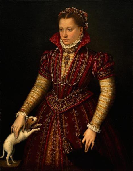 Lavinia Fontana’s Portrait of a Noblewoman from 1580 shows us Italian fashion for a wealthy woman of the time. She wears a high collar and a starched ruff with a picot edge. The gown is stiff and encrusted with embroidery and jewels. It was probably a wedding dress, because crimson and dark red were popular colours for a bride. Red was not worn by lower members of society. Sumptuary laws were designed to curb extravagance and the purchase of excess clothing at all social levels, but the laws were particularly strict when it came to luxury clothing at the lower social levels, because it was a way of reserving status for the upper classes.